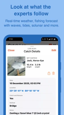 • Catch Log – Log your catches like the professionals. FishVerify creates a catch log and captures the GPS coordinates of each catch so you can return to the same location over and over again. This also includes the current weather and water conditions (wind, air temperature, moon phase, barometric pressure, cloud coverage, water temperature, wave height, sunrise & sunset). Repeat successful trends to catch more fish the next time you’re on the water!