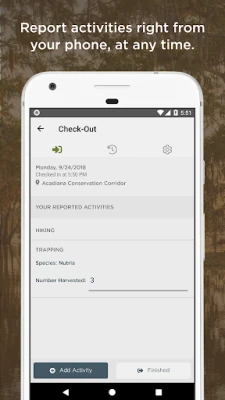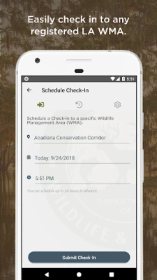 The Louisiana Department of Wildlife and Fisheries makes public lands available for recreation across the state. The LDWF Self-Clearing Permit App is a powerful tool for users of LDWF-administered lands (Wildlife Management Areas (WMAs), Refuges, and Wildlife Conservation Areas (WCAs)) to complete the required self-clearing permit process from their mobile device. While physical self-clearing permit stations are available on WMAs, refuges, and WCAs, LDWF offers this convenient mobile option to provide easy compliance with the self-clearing permit process. This application features a convenient, organized drop-down interface from which users may check in and out when they visit an LDWF-administered land.