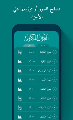 ١- تصفح سور القرآن الكريم أو توزيعها علي الأجزاء المختلفة